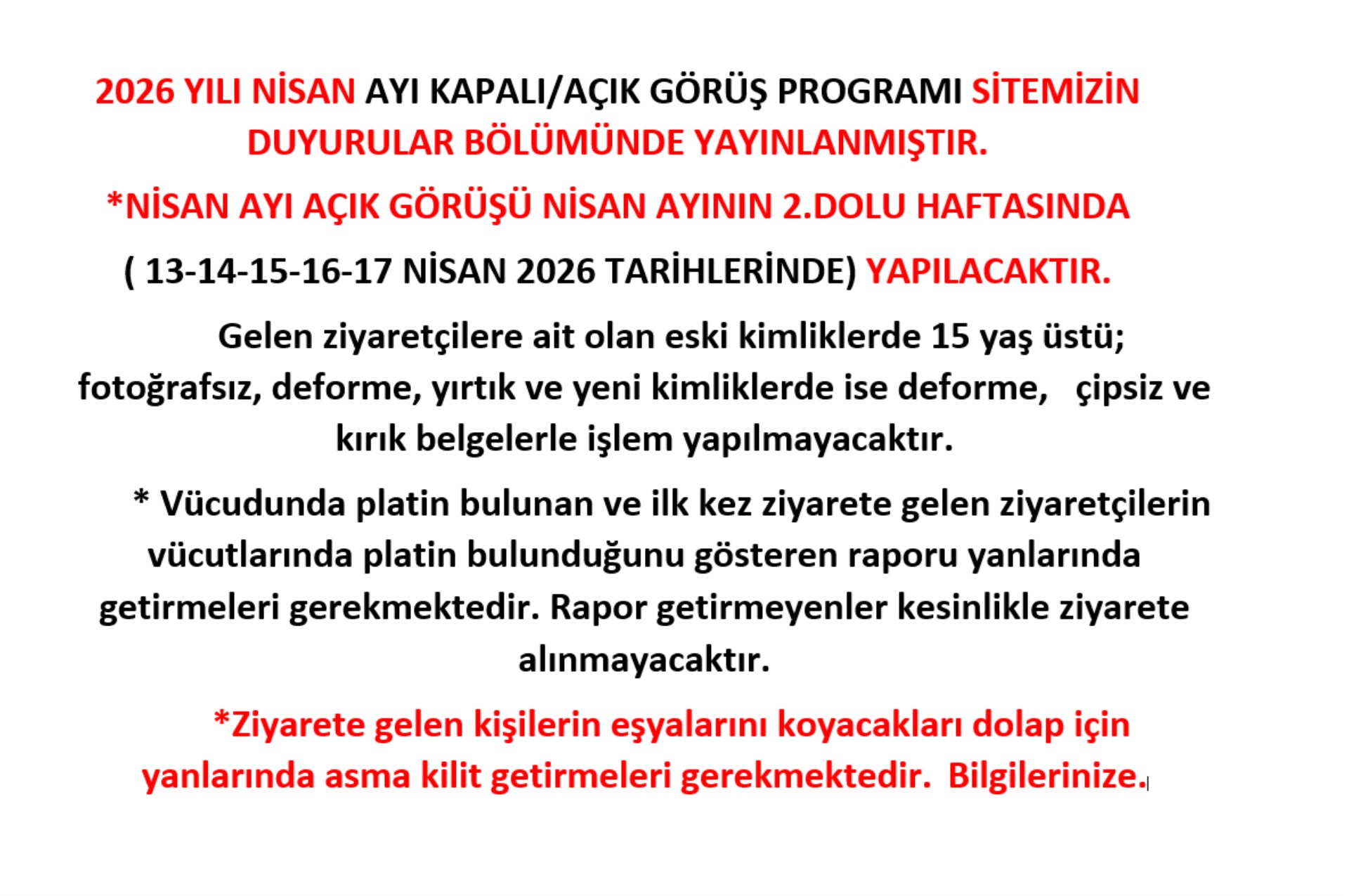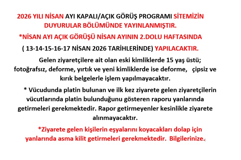 2026 YILI NİSAN AYI KAPALI/AÇIK GÖRÜŞ GÜN VE SAATLERİ BİLGİSİ
